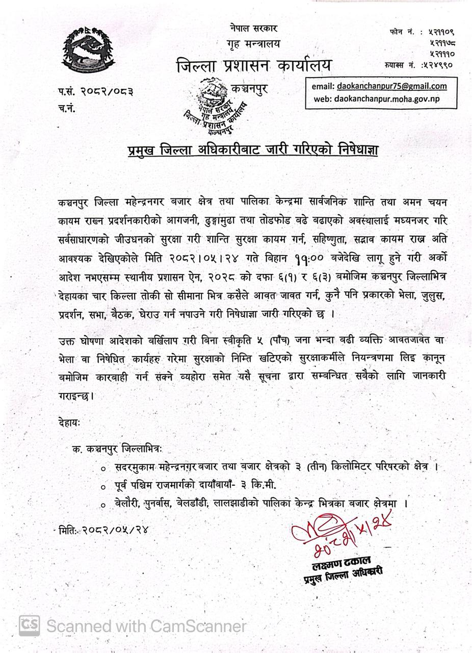 कञ्चनपुरमा भर्खरैमात्र जिल्ला प्रशासन कार्यालयले कञ्चनपुरको केहि क्षेत्रमा निषेधाज्ञा जारी गरेको छ ।